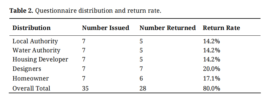 The purpose of the questionnaire was to obtain information from individuals who are responsible for SUDS and professionals associated with SUDS design in residential developments. The questionnaire was issued to the Local Authority, Water Authority, Housing Developers, Consultant Engineers, and homeowners. The response rate was well balanced through each stakeholder type with a minimum of 5 out 7 responses received from each with a return rate percentage of 80% as shown in Table 2.
