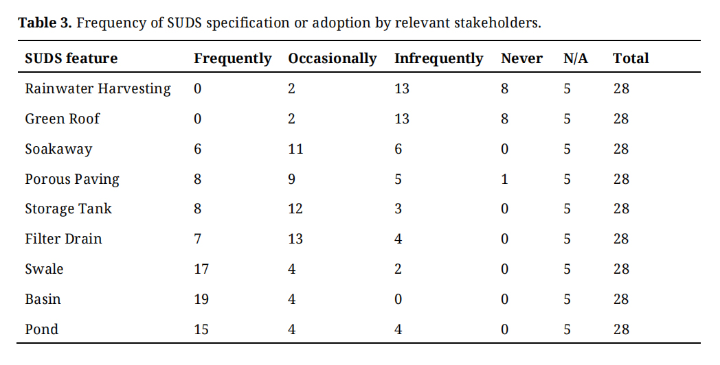 The results of the analysis of the responses about the reasons for frequent adoption of the different SUDS features are shown in Table 4. Almost 43% of the respondents stated that a detention basin was very frequently selected as this is a cost-effective install, it is easier to obtain approval from the local authority and governing bodies plus has low maintenance costs throughout its life cycle. These results clearly show that a detention basin is often selected to avoid encountering unnecessary problems throughout the approval process with the local and water authorities.