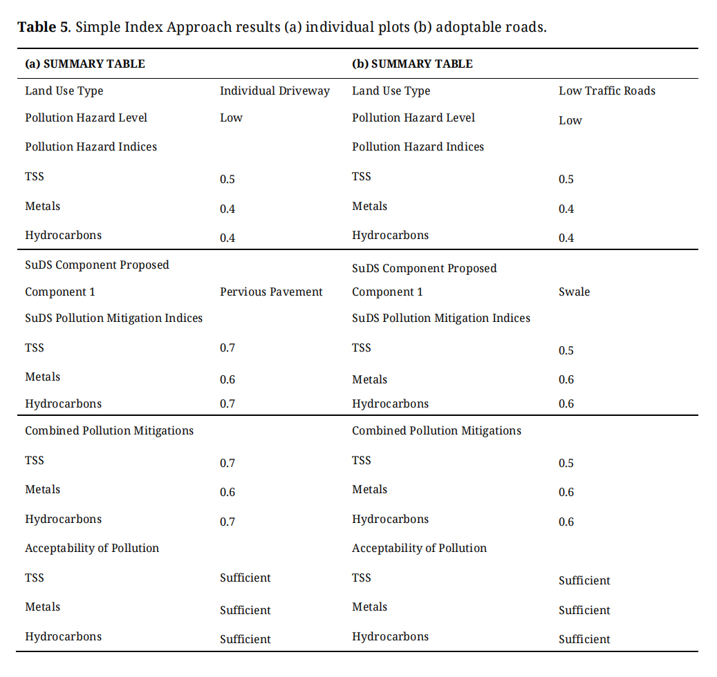 The results of the Simple Index Approach (Table 5) showed that adopting porous paving is a suitable approach towards individual plot control to manage the surface water run-off from each individual house and driveway. Similarly, the results of the Simple Index Analysis for the adoptable roads showed that roadside swales can be used in the re-design as source control SUDS to manage the surface water run-off.