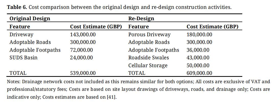 The indicative cost estimates for both the original and the re-design SUDS measures were based on [40] and were exclusive of VAT and professional/statutory fees to allow for like-for-like comparison rather than comparing commercial costs of different products. The cost estimates were based on the same site layout drawings of driveways, roads, and drainage and did not include the drainage network costs as these were likely to be similar for both designs.