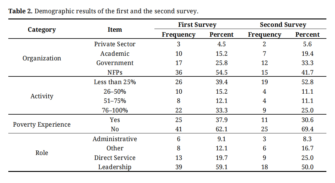 Data collection was executed via an online survey platform, which afforded participants the flexibility to complete the surveys at their convenience. Additionally, the opinions of beneficiaries were sourced from existing secondary data, while the participants engaged in the surveys were intermediaries closely linked to the topic. This paper used the expert non-probability sampling technique [55] to cover the involved knowledgeable population, that was those people who had any kind of relationship to the poverty challenges in the city of Saint John. An invitation along with three reminders was sent to all of them every 20 days to encourage a higher rate of response for the two surveys, resulting in a response rate of 35.7% with 66 participants completing the survey.