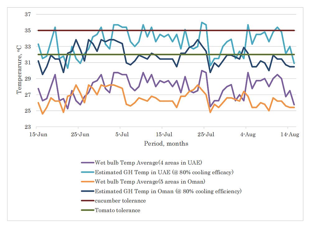 Figure 1. Average daily wet-bulb Temp in UAE (Abu Dhabi, Dubai, Fujairah and Al Ain) and Oman (Semail, Seeb, Al Merat, Muscat, and Ibra), between 15 June to 15 August 2022 and estimated greenhouse temperatures based on 80% efficiency of evaporative cooling system [9].