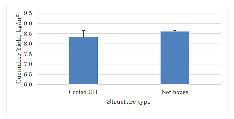 This study aimed to combine five technologies—closed soilless production system, net house, ultra-low pressure irrigation system, root zone area cooling, and low-cost solar energy—to investigate the possibility of improving cucumber crop productivity and extending the production period during the summer months (June to August) in the net house.