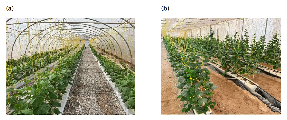 Figure 3. (a) Cucumber crops in Oman and (b) UAE net houses with closed hydroponic systems.
