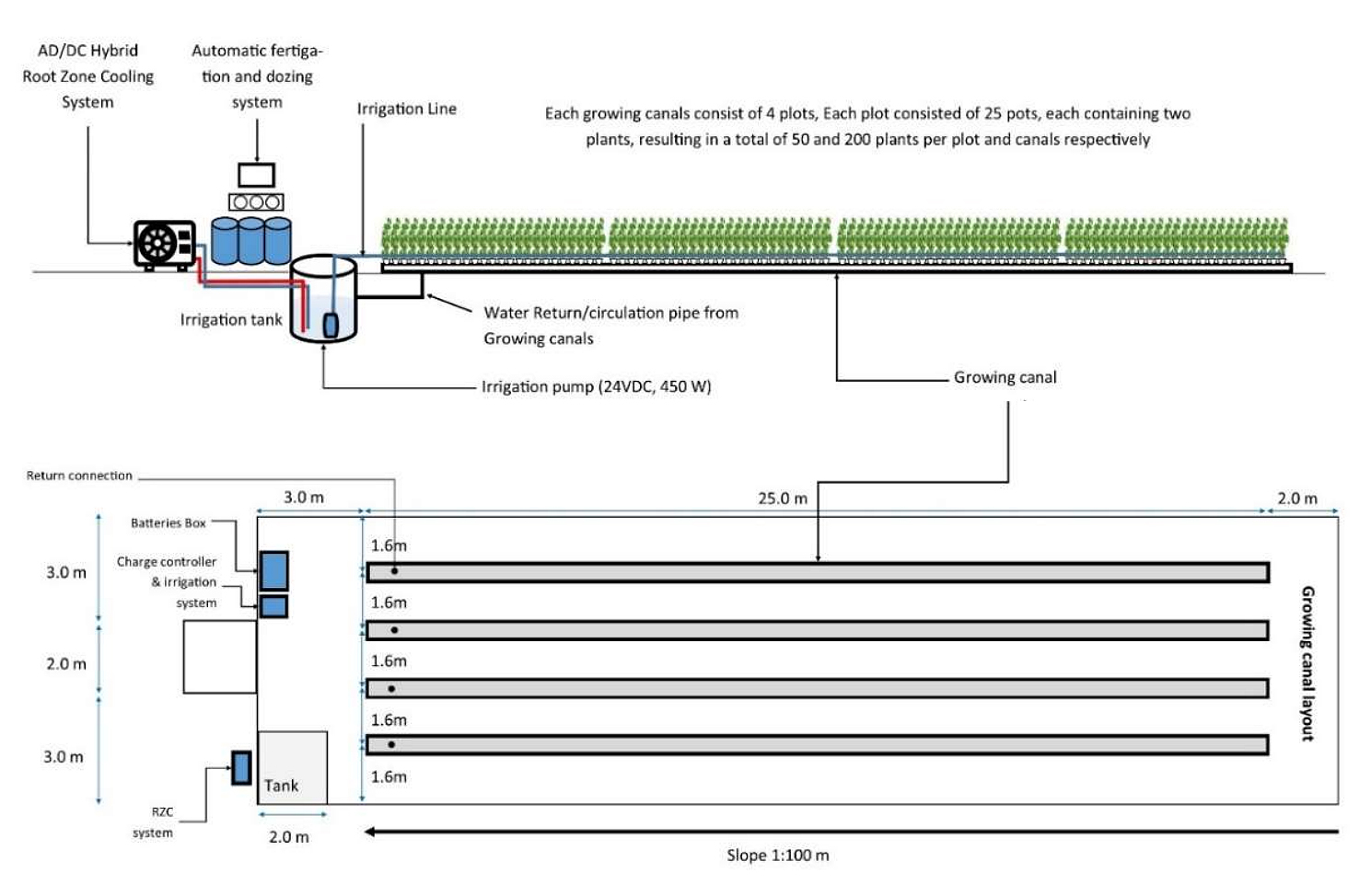 The irrigation system also used Ultra Low Energy Drippers 8 L/h (Jann Irrigation, India), as well as an AD/DC hybrid solar root zone cooling system. The 1.5-ton root zone system (SOLARGREEN, China) used 5 panels of 350W each. Additional insect-proof netting was added to provide shading (Figures 3 and 4).