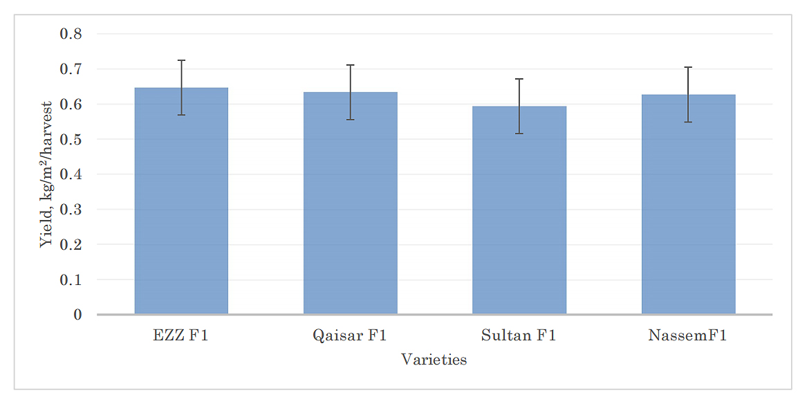 Figure 5. Average cucumber yield by verities (kg/m2/harvest) in UAE (26 May to 10 Aug 2022).