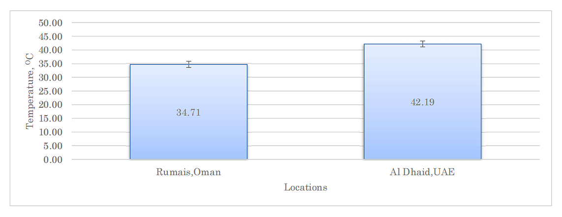 The maximum average daily temperature during the production period (Week 6 to 12) in each location was compared using a t-test, which revealed a significant difference (p < 0.000) between the two locations (Figure 8). Oman also benefits from lower humidity as presented in Figure 1.