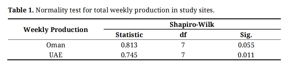 Table 2 presents a comparison of the mean weekly yields, indicating a significantly superior production volume in Oman.