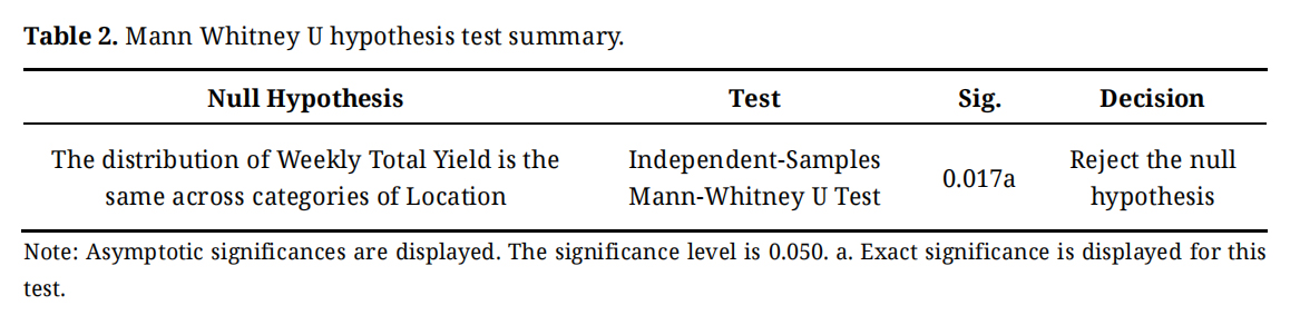 In our analysis, we employed the Shapiro-Wilk test to examine the normality of the total weekly production across both sites. Our findings reveal a deviation from the normal distribution in the production output within the UAE, as illustrated in Table 1. Consequently, we resorted to the Mann-Whitney U Test to investigate the discrepancy in production between the two locations.