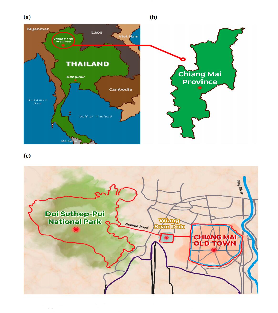 Tourism is Thailand’s main source of income and contributes to the country’s economic development. Cultural tourism focuses on national treasures and does not harm the environment or ecosystem. In accordance with Thailand’s national policy, cultural tourism can encourage local learning and economic distribution. The United Nations established Sustainable Development Goals (SDGs) and issued 36 recommendations for sustainability policy. Thailand signed an agreement to work with the rest of the globe to achieve this goal. As part of a long-term national development plan that focuses on the expansion of different economic sectors, the government developed a policy that emphasizes preservation of tourism resources in order to ensure their future viability. Thailand plans to achieve carbon balance (carbon neutrality) in 2030 as part of sustainability and self-sufficiency efforts. This issue falls within the development principle of the Bio-Circular-Green Economy (BCG model), a paradigm of economic development. By stressing the use of bio-resources (Bio-economy) which exist in a variety of forms in Thailand, the method can focus on the development of numerous sectors, particularly tourism. A “Green Economy” stresses the conservation of existing resources through efficient and repeated use (Circular Economy) to limit both the amount of resources that must be imported from other nations and the amount of environmental damage done. These efforts include circulating and reusing all existing resources for the greatest benefit (Circular Economy). They preserve other resources that must be acquired from outside and have the least environmental impact (Green Economy). The map location of Thailand country, Chiang Mai province and the old town and subdistrict area in Chiang Mai can be demonstrated in Figure 1.