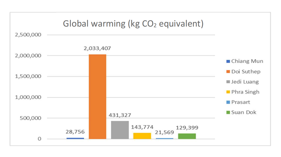 Figure 11. Global warming impact from six tourist destinations in Chiang Mai.