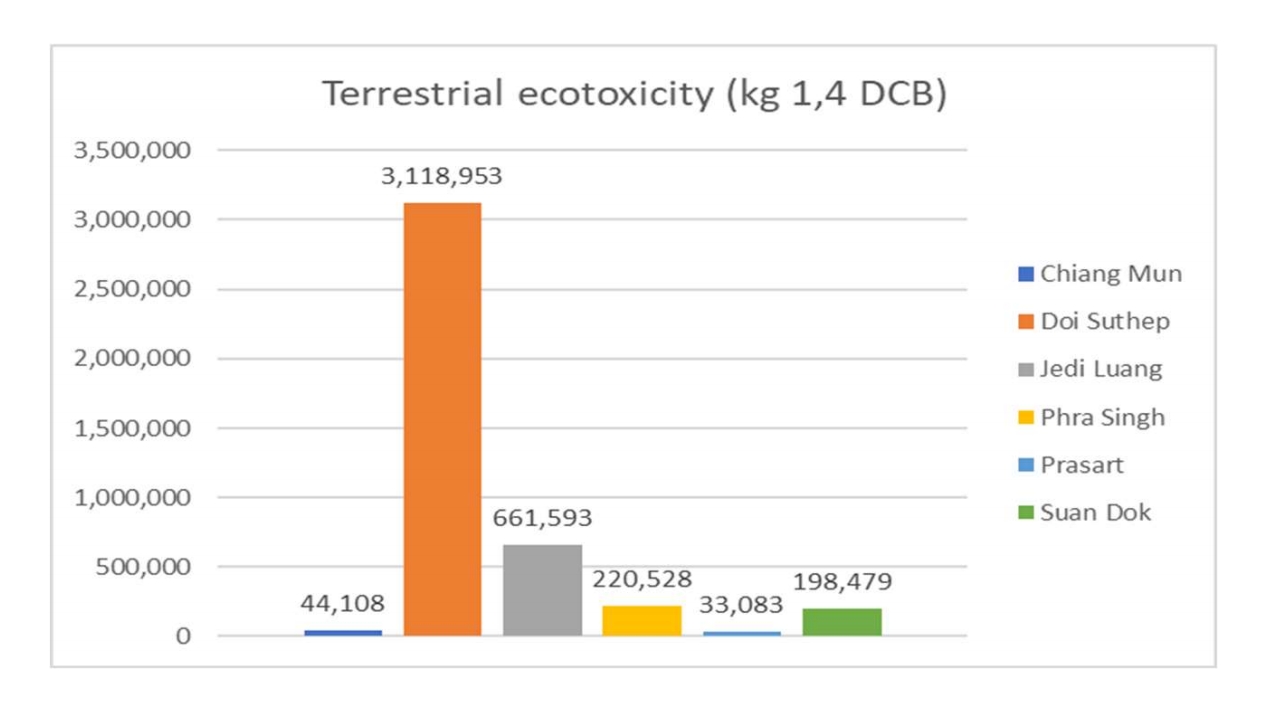 Figure 12. Terrestrial ecotoxicity impact of six tourist destinations in Chiang Mai.