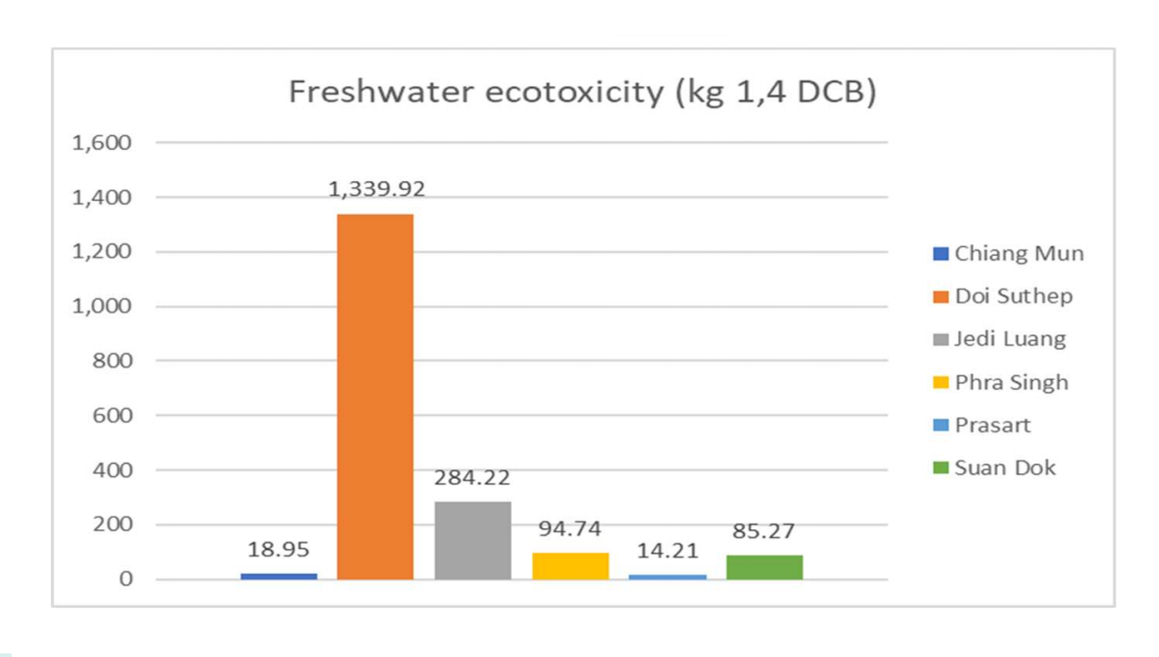 Figure 13. Freshwater ecotoxicity impact from six tourist destinations in Chiang Mai.