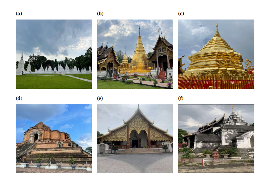 Figure 2. (a) Wat Suan Dok (author); (b) Wat Phra Singh Woramahaviharn (author); (c) Wat Phra That Doi Suthep Ratchaworawihan (author); (d) Wat Chedi Luang Worawihan (author); (e) Wat Chiang Man (author); (f) Wat Prasat (author).