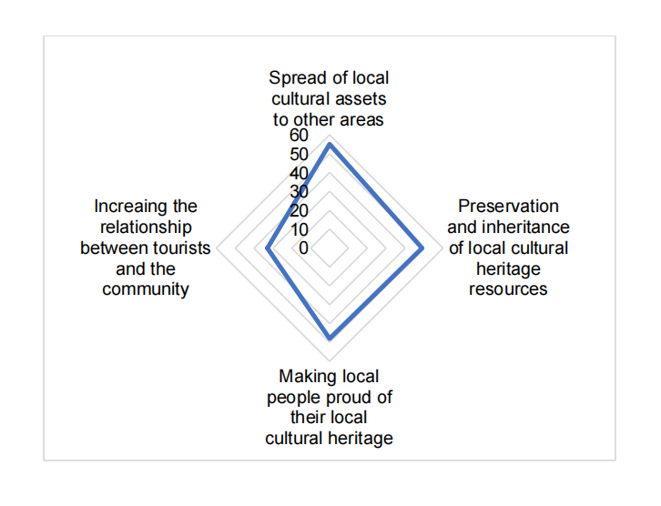 The most positive social and cultural influence has been the spread of local heritage to other locations. This has contributed to the preservation and transmission of local cultural heritage materials, made locals proud of their legacy and fostered positive relationships between tourists and the community. The most negative aspect for communities is a fear that their valuable cultural heritage will become a tourism product. In addition, acceptance from tourists may cause local cultures to change, potentially causing ethical and criminal problems. There was also concern that improving facilities in tourist attractions to accommodate visitors will affect daily life.