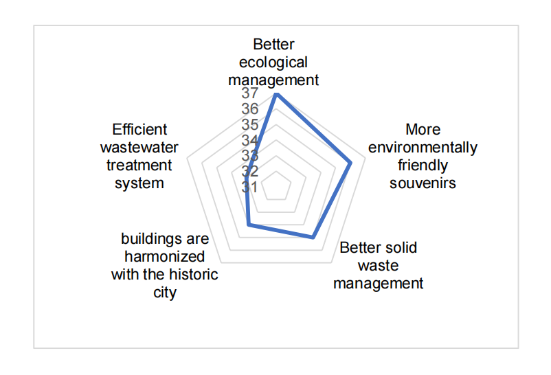 Based on a survey, several local residents described potentially positive environmental impacts. The majority of respondents claimed that ancient sites should have better ecological management (37%), create more environmentally friendly souvenirs (36%), have better solid waste management in tourist attractions (35%), ensure constructed buildings are consistent with an historic city (34%) and have an efficient wastewater treatment system (33%) as shown in Figure 9. However, they believed there will be negative ramifications includes non-biodegradable trash from tourist sites (48%), deteriorated and disorderly tourist attractions (33%), and more air pollution (32%). A minority was concerned about lack of capacity due to a larger number of tourists (22%) as shown in Figure 10.