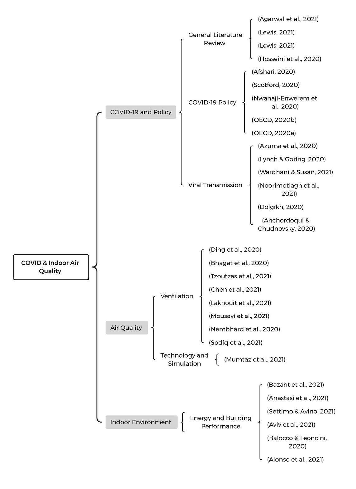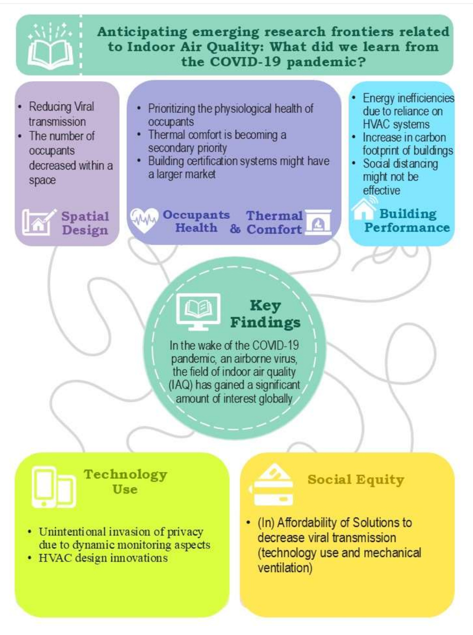 An improved level of IAQ is a key priority for safeguarding the health and comfort of occupants. This review presents a snapshot of urgent IAQ topics being re-investigated in light of the pandemic: spatial design considerations, occupant health and comfort, building performance and ventilation, technology use, energy efficiency, and health and social equity.