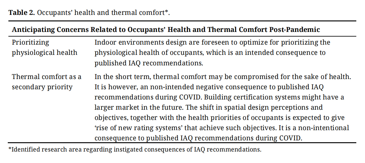 Results: Topics included the spatial design of indoor environments, occupants’ health, thermal comfort, building performance and ventilation, technology use and energy efficiency, as well as health and social equity. The authors commented on key topics requiring immediate attention from architects, building operators, and researchers.