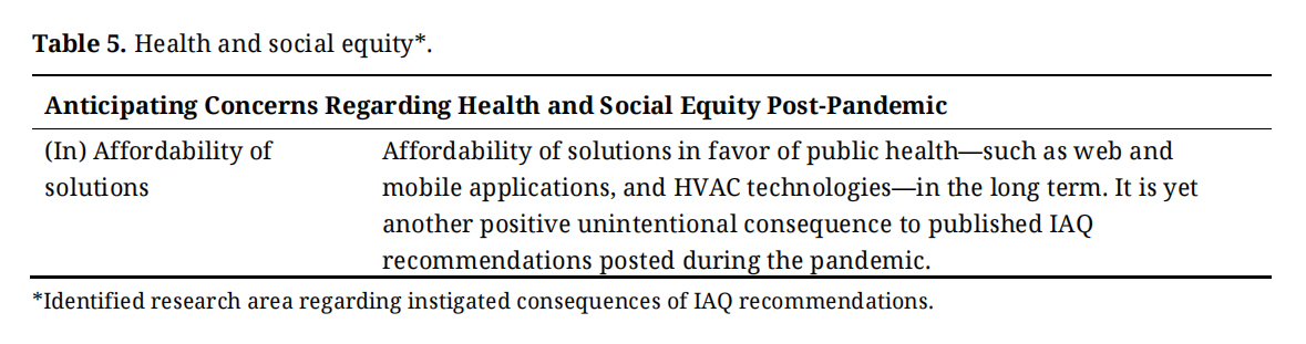 Relying on technology—particularly forms that are not yet affordable—to improve IAQ and mitigate viral transmission has often-neglected implications on social equity. The fact that spatial requirements lean more towards individualistic spaces supports the argument for the lack of social equity, as these spaces may not be an affordable option for the larger community.