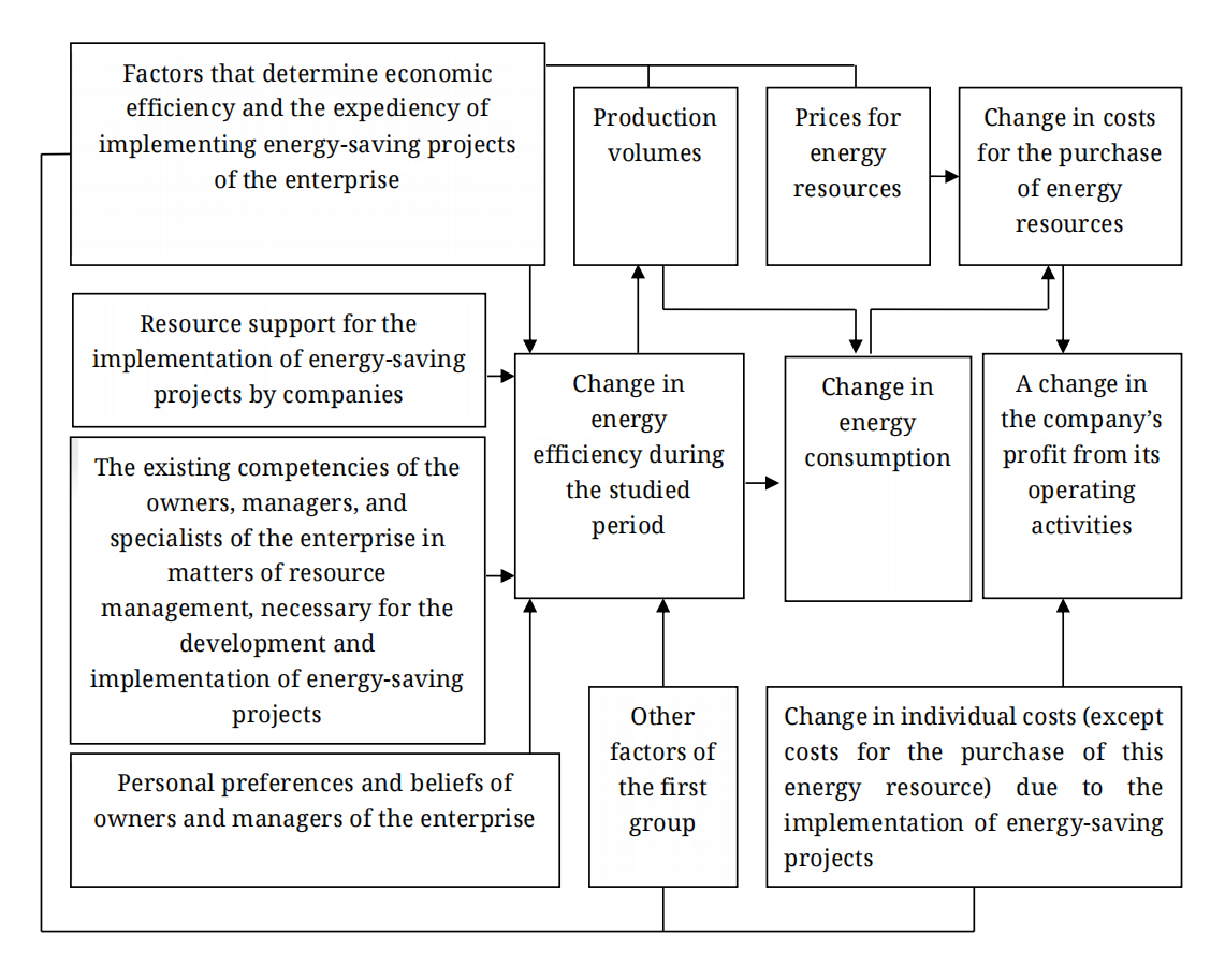 (1) Factors that consider economic efficiency and determine the expediency of implementing energy-saving projects of companies. These factors include those that have a direct impact on the expected level of profitability of investments in the enterprise’s implementation of certain energy-saving measures, as well as on the value of the net present value of the corresponding energy-saving projects;
