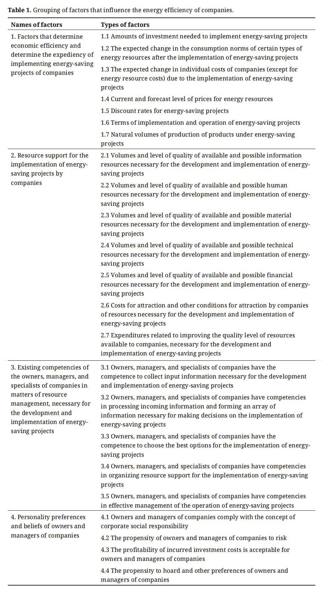 (3) Existing competencies of the owners, managers, and specialists of companies in matters of resource management, necessary for the development and implementation of energy-saving projects. The mentioned competencies, in turn, can be divided according to the stages of the process of development and implementation of energy-saving measures;
