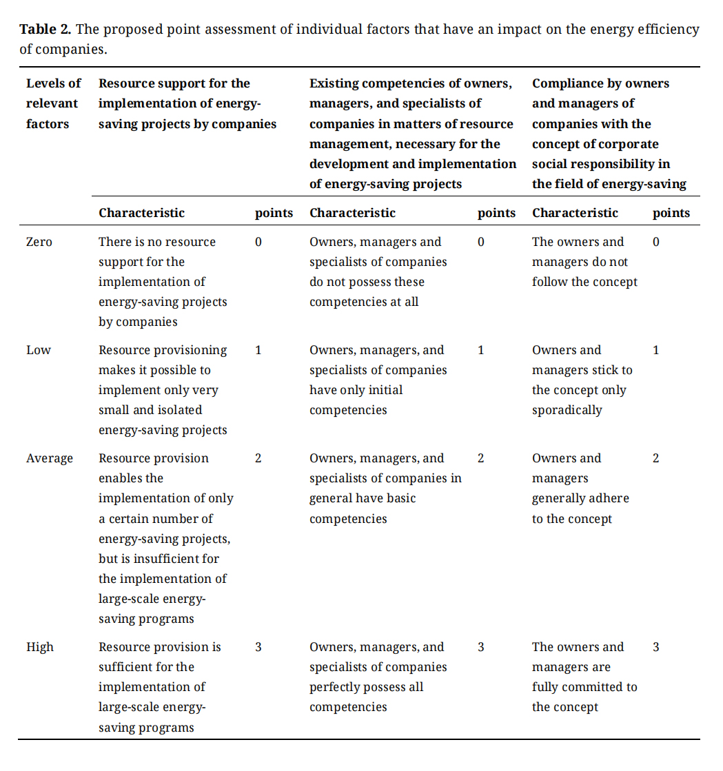 The problem of energy saving at companies is of interest to many scientists. At the same time, the researchers paid considerable attention to the issues of methodological support for the process of methodological support issues for companies. In particular, scientists proposed methods for evaluating the effectiveness of these projects (Szafranko, 2022) [1], formed an information base for such evaluation (Krones and Müller, 2014) [2], and determined criteria for selecting the best energy-saving projects (Krenn et al., 2015) [3], the theoretical and methodological principles of the formation of programs of energy-saving investment measures by companies have been developed (Richert, 2017) [4], the conditions under which these programs can be successfully implemented have been determined (Máša et al., 2018) [5].