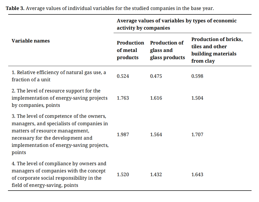 For each type of economic activity, data were collected on 50 companies located in the western region of Ukraine. At the next stage of the research, the investigated companies for each branch were divided into groups with low, medium, and high efficiency of natural gas use in the base year. It was the companies of the first group (their total number is 87) that were chosen as the final objects of the study. Having estimated the value of the selected variables for each enterprise in the base year, formula (2) determined their averaged values. As can be seen from the data presented in the Table 3, the average values of all studied variables are not very high. In particular, the relative efficiency of using natural gas varies from 0.475 to 0.598 (i.e., from 47.5% to 59.8% of the maximum possible). As for the score of factors influencing this efficiency, in most cases, it is in the range of 1.5 to 2.0 (with the maximum possible value equal to 3.0).