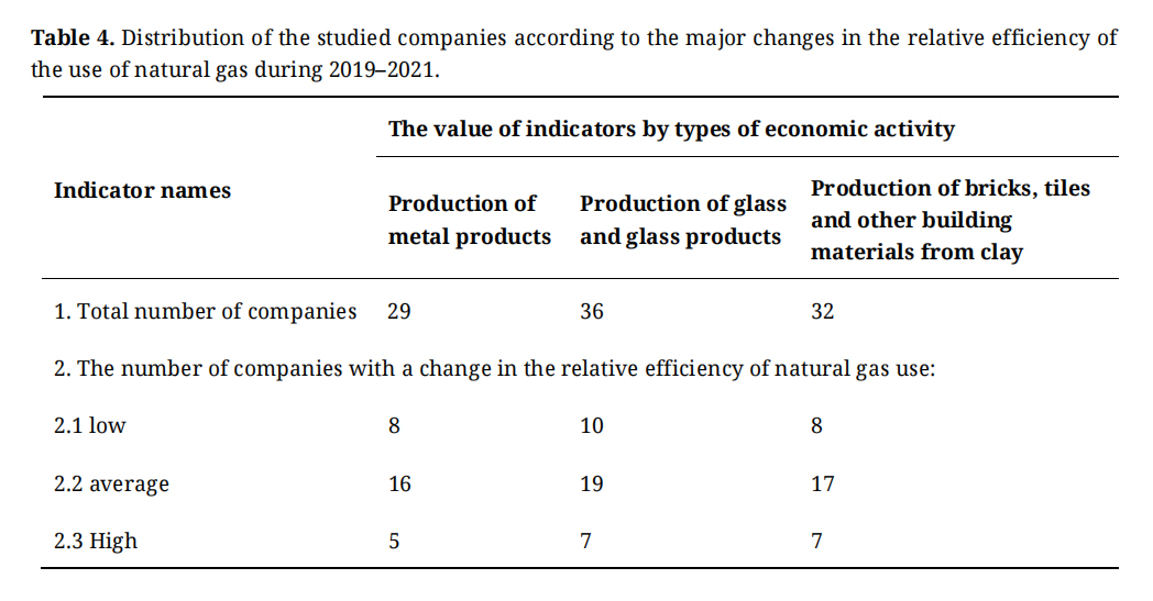 At the next stage of the research, the values calculated according to formula (1) for each enterprise were divided into three groups: low (less than 0.05), medium (from 0.05 to 0.1), and high (greater than 0.1). As can be seen from the data in the Table 4 for all three types of economic activity, the majority of companies belong to the group with average values of changes in the relative efficiency of natural gas use.