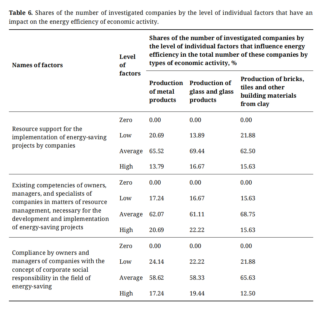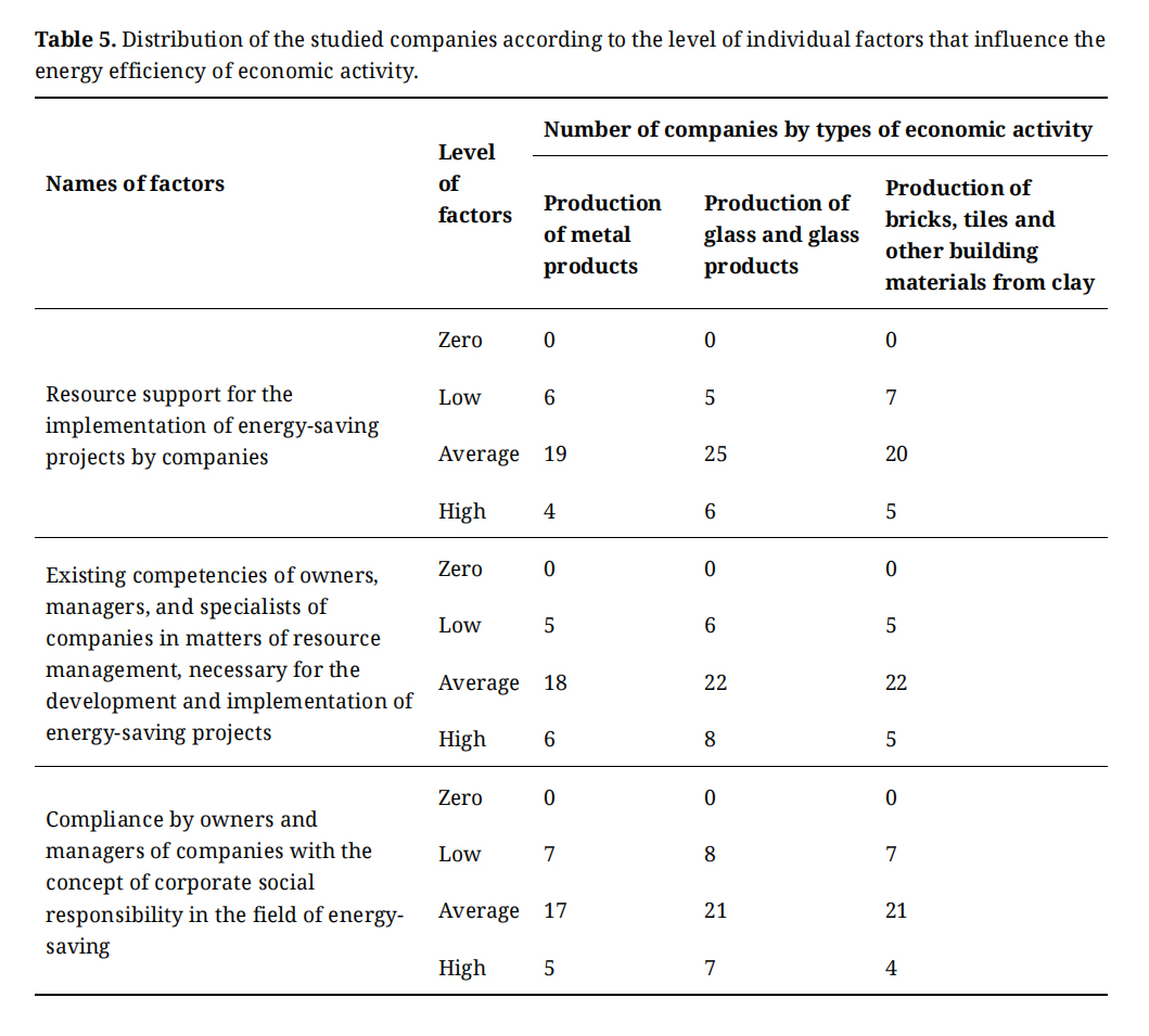 Stage 4. Determination of the level of resource support for the implementation of energy-saving projects for each of the selected companies, the level of competence available to the owners, managers, and specialists of the enterprise in matters of managing this provision, and the level of compliance by the owners and managers of the companies with the concept of corporate social responsibility in the field of energy saving. As for other factors that characterize the personal preferences and beliefs of owners and managers, it is assumed that they are to some extent determined by the competencies available to owners and managers. At the same time, if the final results of the study are not statistically significant, then in this case it is advisable to add to the consideration other factors that characterize the personal preferences and beliefs of owners and managers.