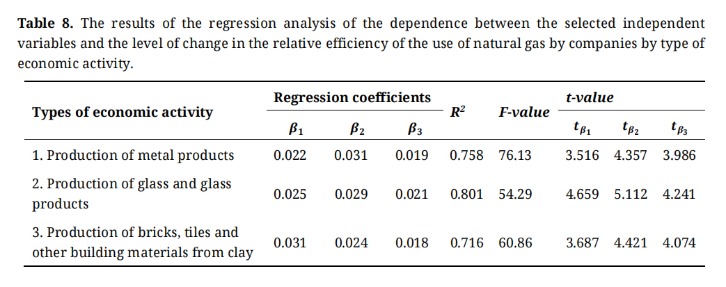 Correlation-regression analysis methods were used to establish statistical dependence between the studied factors and the change in the relative efficiency of natural gas use by companies during 2019–2021. As follows from the data given in the Table 7, each of the three independent variables has a moderate effect on the resulting indicator. At the same time, there is no significant mutual influence between the independent variables. As for the regression model (3), as can be seen from the data in the Table 8, the parameterization of this model led to a statistically significant relationship between the selected influencing factors and the change in the efficiency of natural gas consumption by companies. At the same time, this conclusion is valid for all three types of economic activity that were considered.
