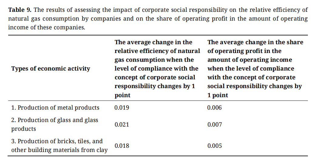 So, as follows from the data in the Table 9 with an increase of one point in the level of compliance by owners and managers of companies with the concept of corporate social responsibility in the field of energy saving, the average change in the relative efficiency of natural gas consumption and the average change in the share of operating profit in the amount of operating income are, respectively: for companies that produce metal products—0.019 and 0.006; for companies producing glass and glass products—0.021 and 0.007; for companies that produce bricks, tiles and other building materials from clay—0.018 and 0.005.