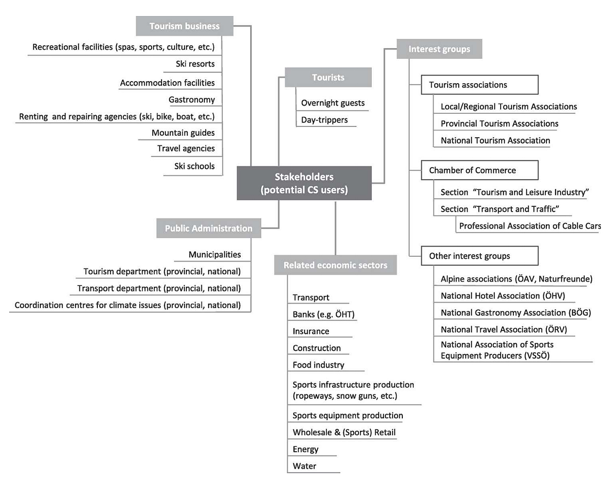 Figure 2. Stakeholder mapping—potential CS users in the tourism sector. Note: This figure has been adapted from “The market for climate services in the tourism sector—An analysis of Austrian stakeholders’ perceptions” by Damm A, Köberl J, Stegmaier P, Alonso EJ, Harjanne A, 2020, Climate Services, 17, 100094 (https://doi.org/10.1016/j.cliser.2019.02.001) [39]. Copyright 2020 by Elsevier.
