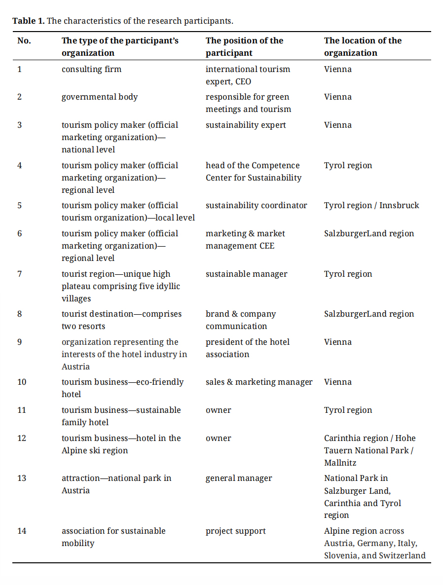Interviews were conducted online via platforms such as Skype, Zoom and MS Teams based on previously scheduled appointments, and typically lasted between 45 and 60 minutes. A total of 14 interviews were conducted with sustainability experts actively involved in the Austrian tourism planning and development. The interviews were conducted in English based on an interview guideline.