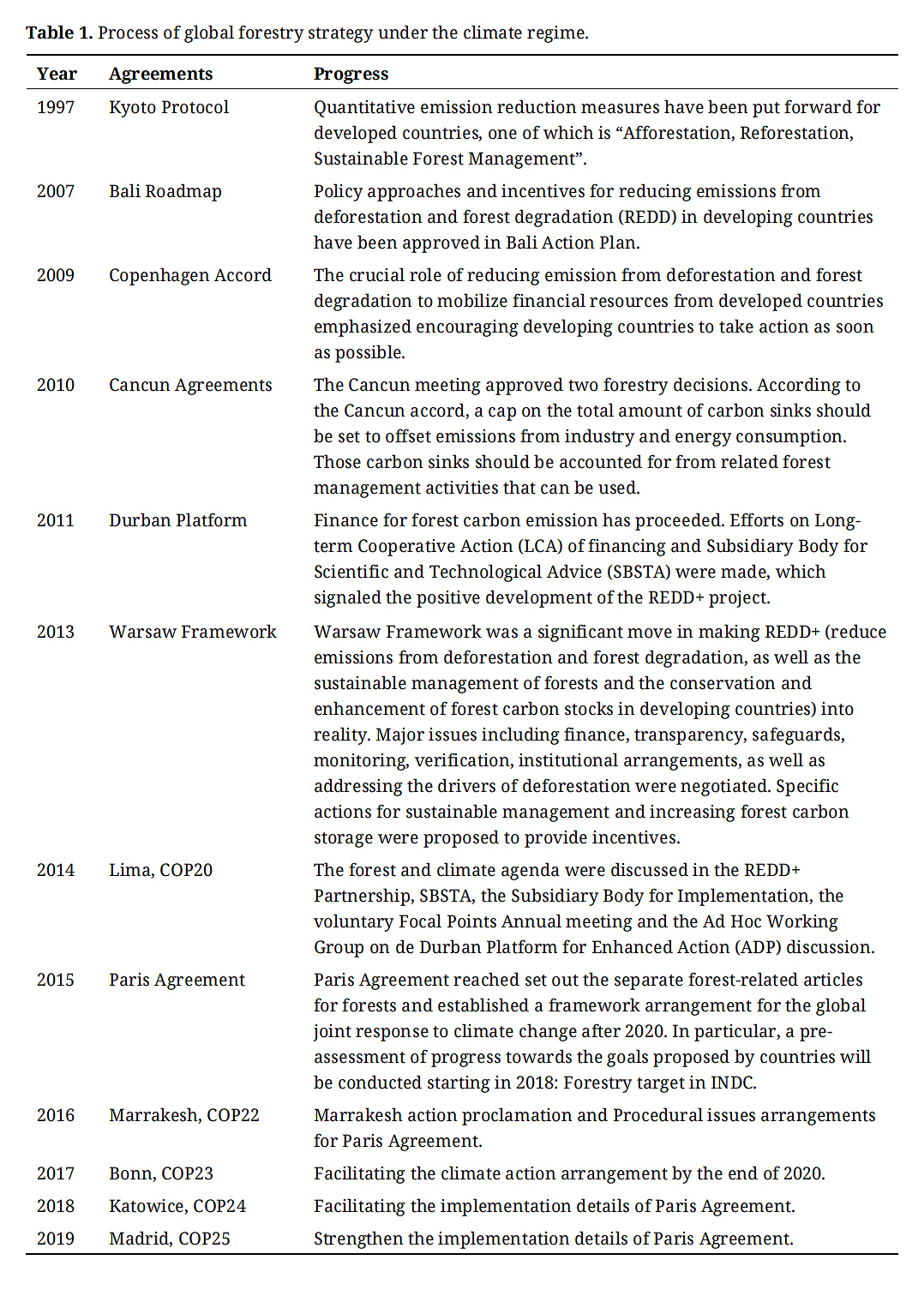The 2015 Paris Climate Agreement (UNFCCC 2015a) recognized the significance of forests in eliminating extra CO2 from the atmosphere, highlighting the role of cutting emissions through forest protection and avoiding deforestation and forest degradation after 23 years of the climate treaty [14]. Table 1 summarized the process of forestry strategy at the global scale to better understand the role of forests in the global climate regime.