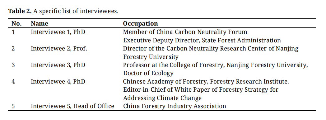 This paper aims to find forestry development policies to strengthen the sustainable and effective implementation of China’s forestry strategy toward carbon neutrality. Therefore, the main interview targets are civil servants, professors, researchers, and experts directly involved in forestry development policies. They are in key positions in forestry development and have unique experience and insight into issues such as climate change mitigation and its relationship with carbon neutrality. The specific list of interviewees is displayed in Table 2.