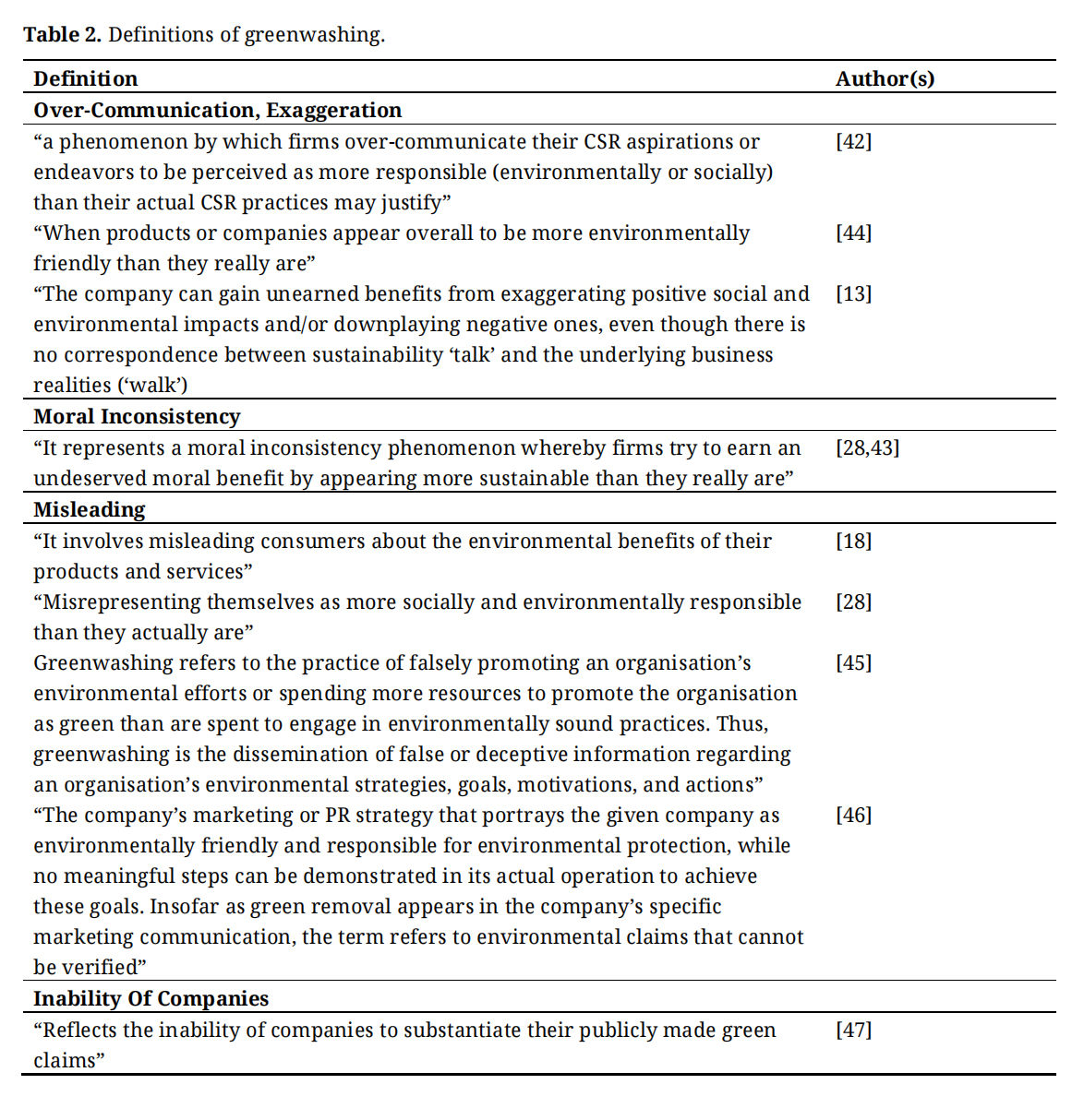 Analyzing the recent definitions of greenwashing, it can be concluded, that a generally accepted definition does not exist, however, the emphasis can be different. [41] argues, that there are different shades in greenwashing, and not all types of greenwashing activities are equal. Checking the keywords: over-communication [42]; a moral inconsistency [28,43] misleading, exaggerating, reflecting inability, dissemination of false or deceptive information reflect the essence of the phenomenon (See in Table 2). In summary, greenwashing embraces giving false information and exaggerating the green characteristics of different products and services in order to get more consumers.