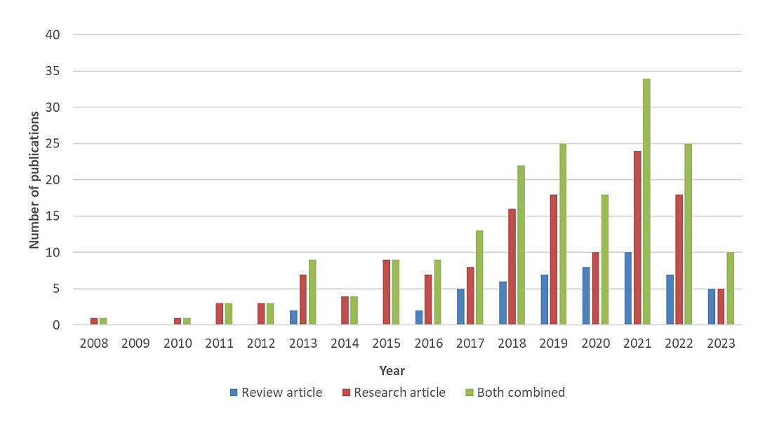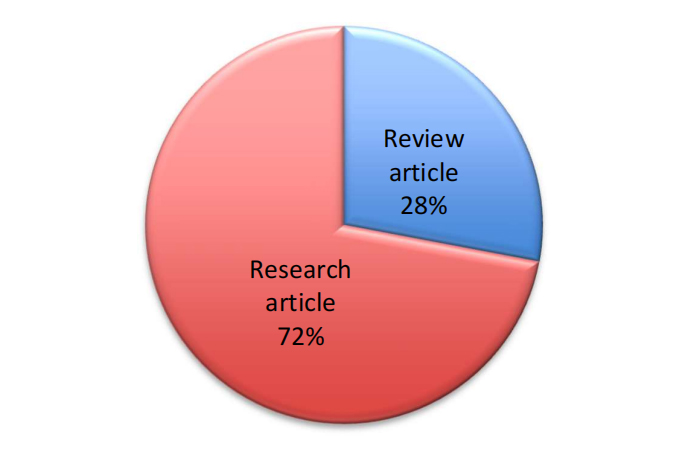 The analysis identified a total of 186 articles related to the LCSA. It has been found that more articles were identified in ScienceDirect than in WOS and SCOPUS. By utilising the inclusion and exclusion criteria during the appraisal, duplicate articles were eliminated by cross-reviewing the sources. As a result, 133 LCSA articles are identified in ScienceDirect, 48 in SCOPUS, and 5 in WOS (Table 1). In addition, it seemed that most reviews and research articles were published in 2021 (Figure 1). The findings also highlighted a consistent increase in articles published from 2010 to 2021, illustrating the significant interest in research related to this field. Moreover, the analysis also determined that review articles comprised 28% of the articles, while the remaining 72% were research articles (Figure 2).