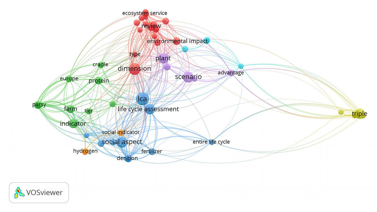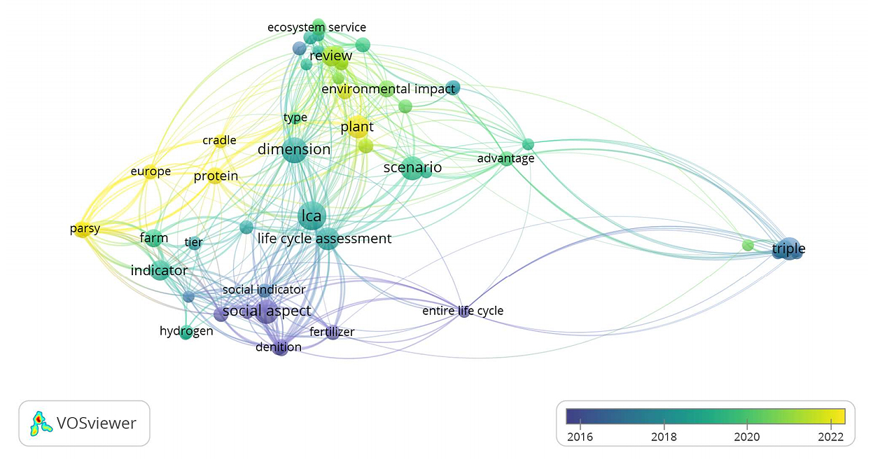 LCSA Studies Related to the Agricultural SectorThe analyses identified 22 out of 186 articles related to LCSA in the agricultural sector (refer Table 1 and Figure 3). As mentioned earlier, agriculture is defined according to Harris and Fuller’s definition [34]. As such, any studies covering complete or partial agricultural processes of crop cultivation and domestication, as well as livestock management, were considered during the categorisation process. Figure 4 provides information on the sources of the articles by country, along with their respective authors. From the figure, it is apparent that the majority of the articles were produced in Europe, with Italy (6 articles), Spain (5 articles), Sweden (3 articles) as the leading contributors. Whereas Germany, Norway, Finland, and Ireland each produced one related article. Furthermore, VOSViewer was used to analyse related terms within the title and abstract. The analysis identified 866 related terms from the 22 publications. Figure 5 shows 100 terms with the threshold of 3 occurences and a 60% terms selection. It was apparent that the terms ‘lca’ (LCA) had the highest occurrence with 17 times, followed by ‘dimension’ (14 times), ‘social aspect’, and ‘scenario’ (each 12 times). Moreover, the terms ‘triple’, ‘plant’, and ‘life cycle assessment’, each had 11 occurences. Another agricultural significant term, ‘farm’ also stands with a high occurence of 7. Nevertheless, it can also be seen that term occurences experience an increasing trend over time for most of the keywords (based on the timeline depicted in Figure 6).