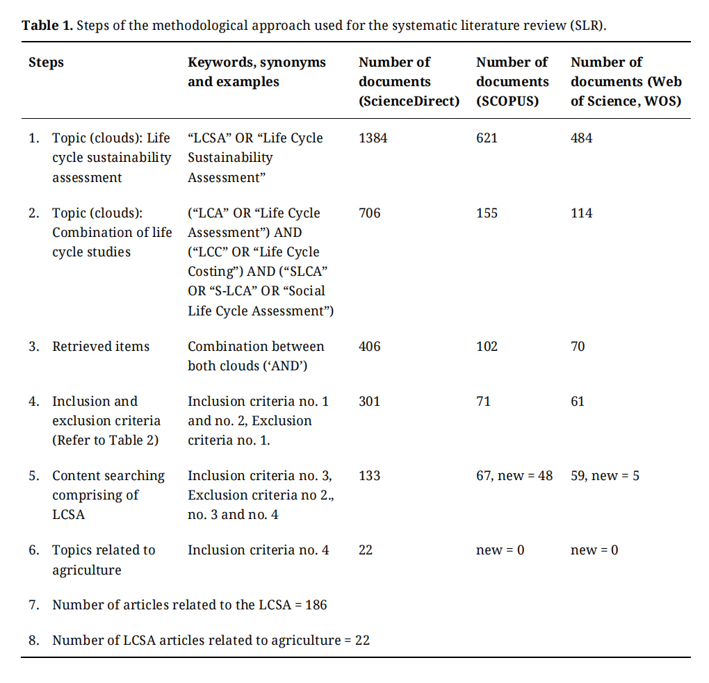 This study has two distinct purposes. Its primary goal is to identify research publications focusing on LCSA in the agricultural sector. This will be achieved by conducting a comprehensive systematic literature review (SLR) of LCSA, encompassing all sectors. Secondly, the study aims to identify specific life cycle thinking elements or indicators in concerning LCA, LCC, and S-LCA that is important for the agricultural sector. Such approaches should have the capability of combining significant indicators to assess sustainability. The outcome will suggest a more effective and robust method to evaluate sustainability in the agricultural sector.