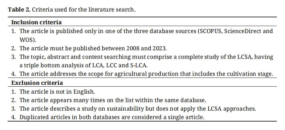 Overall, this paper comprises five sections. Section 1 (INTRODUCTION) introduces agriculture and the developments and progress in life cycle studies. Section 2 (LITERATURE REVIEW METHOD) details the methodology used for the systematic literature review (SLR). Section 3 (RESULTS AND DISCUSSION) presents the results and discussion. This section is divided into a description of the selected articles identified from the SLR and an analysis of articles related to the use of LCSA in other sectors. The section continues by discussing articles associated with the agricultural sector, followed by a discussion of the potential use of the sustainability assessment method. Section 4 (CHALLENGES AND FUTURE DIRECTIONS) elaborates on the challenges and future directions before the conclusion is presented in Section 5 (CONCLUSION).