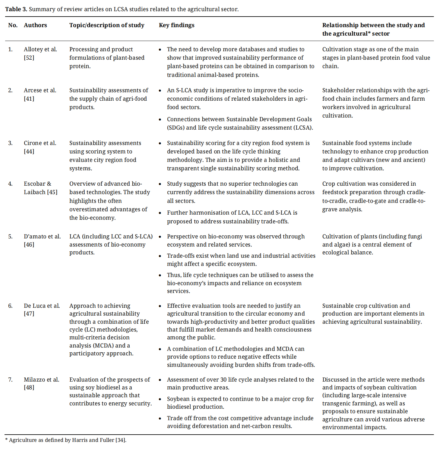 Social life cycle assessment (S-LCA)Social analysis may differ between one study and another, more so than across LCA and LCC studies. Nevertheless, the studies should still be within the framework developed for the S-LCA [97,98]. Literature has been published on social issues related to the agricultural sector, such as proper working conditions [99,100] and occupational hazards [101] that require workers’ attention. In addition, several other S-LCA studies related to agriculture can be used as references for further research. Muhammad et al. [102] highlighted the importance of assessing the satisfaction level among workers and local communities. Therefore, these issues should be explored to better understand the needs and gaps in the agricultural sector.