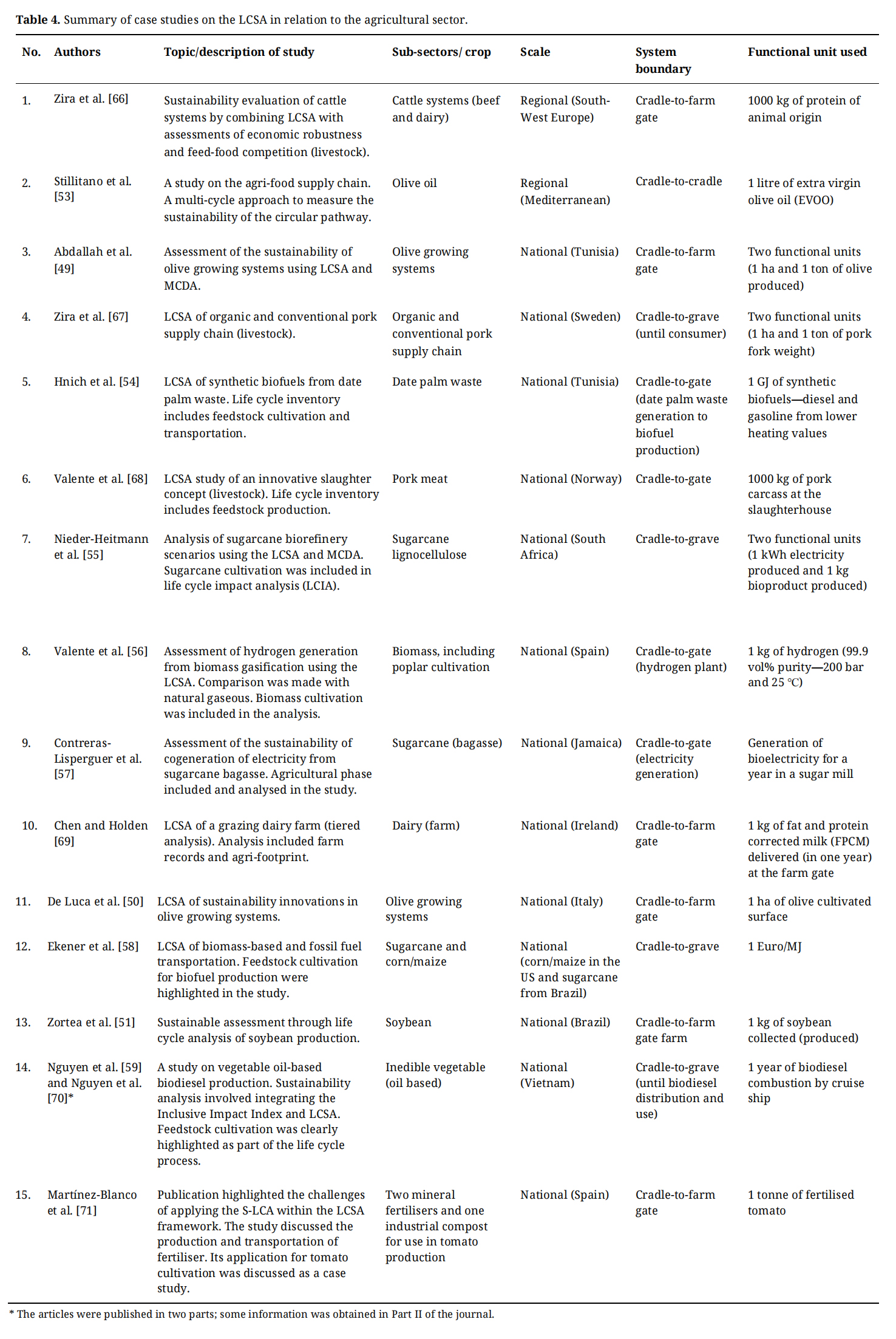 Overall, the case studies related to the agricultural LCSA are comprised of various sub-sectors within the agricultural sector (Table 4). They cover topics on a range of crops such as olives, palm dates, sugarcane, soybean, vegetables, maize, tomatoes, and poplar. Meanwhile, livestock studies cover dairy and animal husbandry, which includes pig and cattle farming. Moreover, in studies discussing system boundaries, the majority of them address either cradle-to-farm gate or cradle-to-gate, with a smaller subset exploring cradle-to-cradle. Further analysis identified three articles that focus directly on the production of raw agricultural materials at the farm gate. These studies include research on olive-growing systems by Abdallah et al. [49], De Luca et al. [50], and soybean production by Zortea et al. [51]. Specific crop cultivation studies within agricultural LCSA refer to system boundaries that cover a cradle-to-farm gate system, instead of subsequent phases such as product manufacturing, consumer usage, or waste management. This approach expounds on the scope of cultivating farms and the need for intensive studies on the crop production stage. Therefore, indicating that the main objective of the studies is to evaluate and understand the cycle within the cultivation boundaries.
