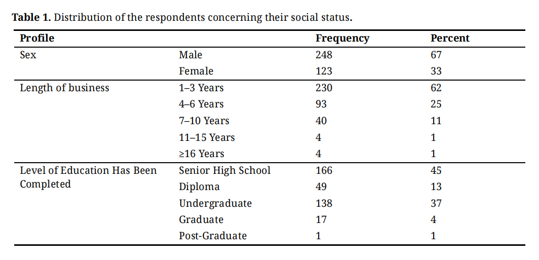 In Table 1, it is explained that of the total 371 MSME entrepreneurs in Indonesia, 248 respondents were male (67%) and 123 respondents (33%) were female. Meanwhile, in terms of the length of business of these MSMEs, 230 respondents (62%) had been in business for 1–3 years, 93 respondents (25%) for 4–6 years, 40 respondents (11%) for 7–10 years, 4 respondents (1%) for 11–15 years, and 4 respondents (1%) for ≥16 years. Regarding the distribution of respondents based on education level, 166 respondents (45%) had completed education up to high school level, 49 respondents (13%) up to diploma level, 138 respondents (37%) up to undergraduate degree level, 17 respondents (4%) up to graduate degree level, and 1 respondent (1%) up to postgraduate degree level.