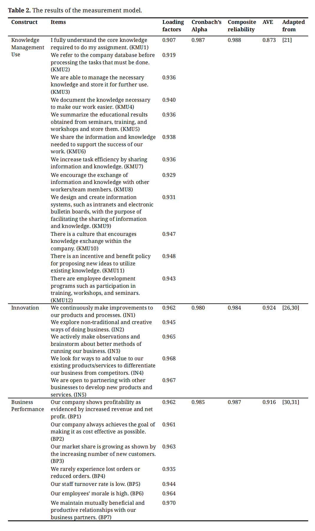 Data AnalysisIn measuring variables, a questionnaire was adapted from previous research. To measure knowledge management use, questions from Wang and Yang’s [21] study were adopted. To assess innovation, a questionnaire from Alyahyaei [30] and Calik [26] was adopted. To assess business performance, a questionnaire from Alyahyaei [30] and Garg [31] was adopted. The questionnaire items were subsequently assessed using a Likert scale consisting of five points, where one point indicated strong disagreement and five points indicated strong agreement [38]. The data was then processed using the SEM-PLS application. The SEM-PLS steps include designing a structural and measurement model, data collection, model estimation, model evaluation, hypothesis testing, and interpretation of results [37,38].