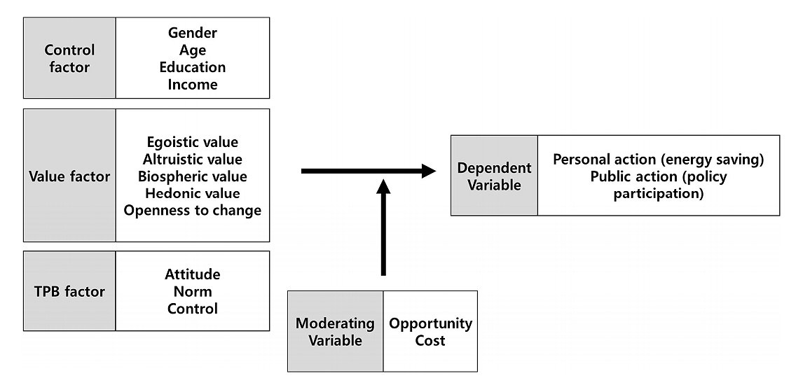 Personal action is affected by various independent variables, but is also moderated by opportunity and cost. Behavior is determined by individual values ​​and attitudes, but it is possible to enhance the effect of energy conservation by facilitating this process. The opportunities and costs invested in this study refer to the resources related to energy conservation that individuals have or the costs required for individuals order to achieve the goal of energy conservation.
