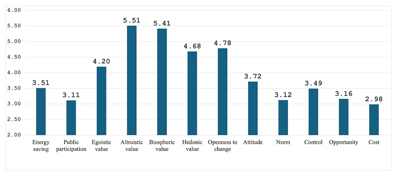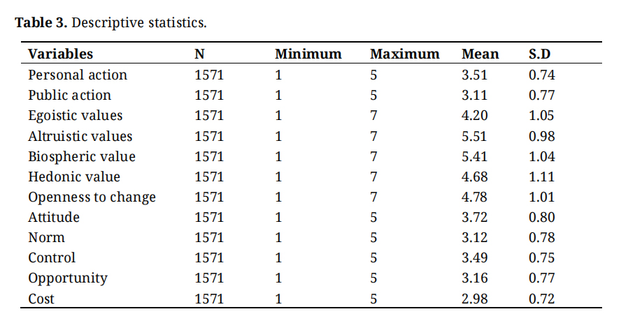 In order to understand the trends of the variables that constitute the research model, the results of the descriptive statistical analysis were reviewed (see Table 3 & Figure 2). The Likert scale of the main variables was used to check the mean and standard deviation. The dependent variable, personal action, i.e., energy saving behavior, showed a higher mean value of 3.51 than public action, i.e., public participation (3.11). In the value factor, Altruistic value ​​(5.51), Biospheric (5.41), Openness to change (4.78), Hedonic value (4.68), and Egoistic value ​​(4.2) appeared in that order (see Figure 1). It was confirmed that the response samples had a high awareness of altruistic values ​​such as equality, harmony, and social assistance, and a relatively high awareness of harmony with nature and environmental protection. In addition, the TPB variables had an average value of Attitude (3.72), Control (3.49), and Norm (3.12). Through these results, it was confirmed that the attitude of concern about climate change and the degree of recognition that one’s own efforts are worthwhile were relatively high. In the opportunity and cost variables, the average of the opportunity variable was 3.16, and the average of the cost was 2.98. This result is a response to the content about the opportunity for climate change behavior because individuals have products or devices for energy conservation, and the cost or institutional constraints for individuals to practice energy conservation. Our data showed that people seem to be reached a somewhat intermediate level of opportunity and cost burden for practicing energy conservation behavior. In other words, since values in opportunity and cost show an intermediate average value of them rather than a result that is biased to one side, we confirmed the need for additional analysis of the opportunity and cost variables.
