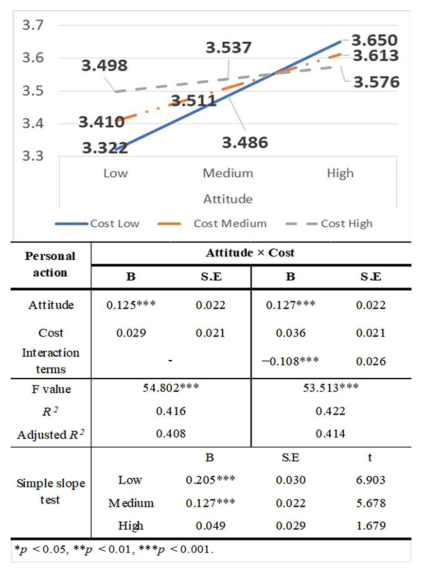 Figure 4. Results of the analysis of the interaction effect of cost on the relationship between personal action and attitude.
