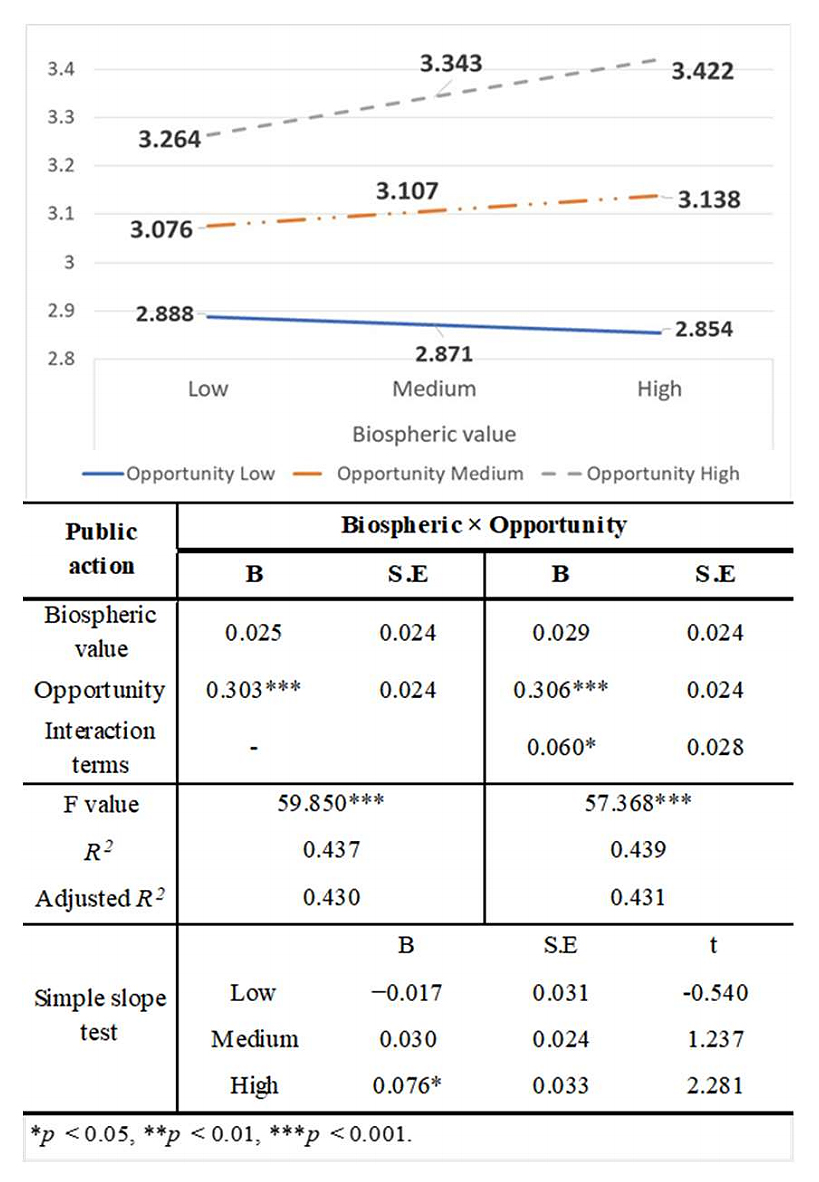 Figure 5. Results of the analysis of the interaction effect of opportunity on the relationship between public action and biospheric value.
