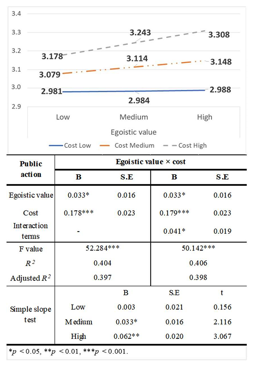 Figure 6. Results of the analysis of the interaction effect of cost on the relationship between public action and egoistic value.