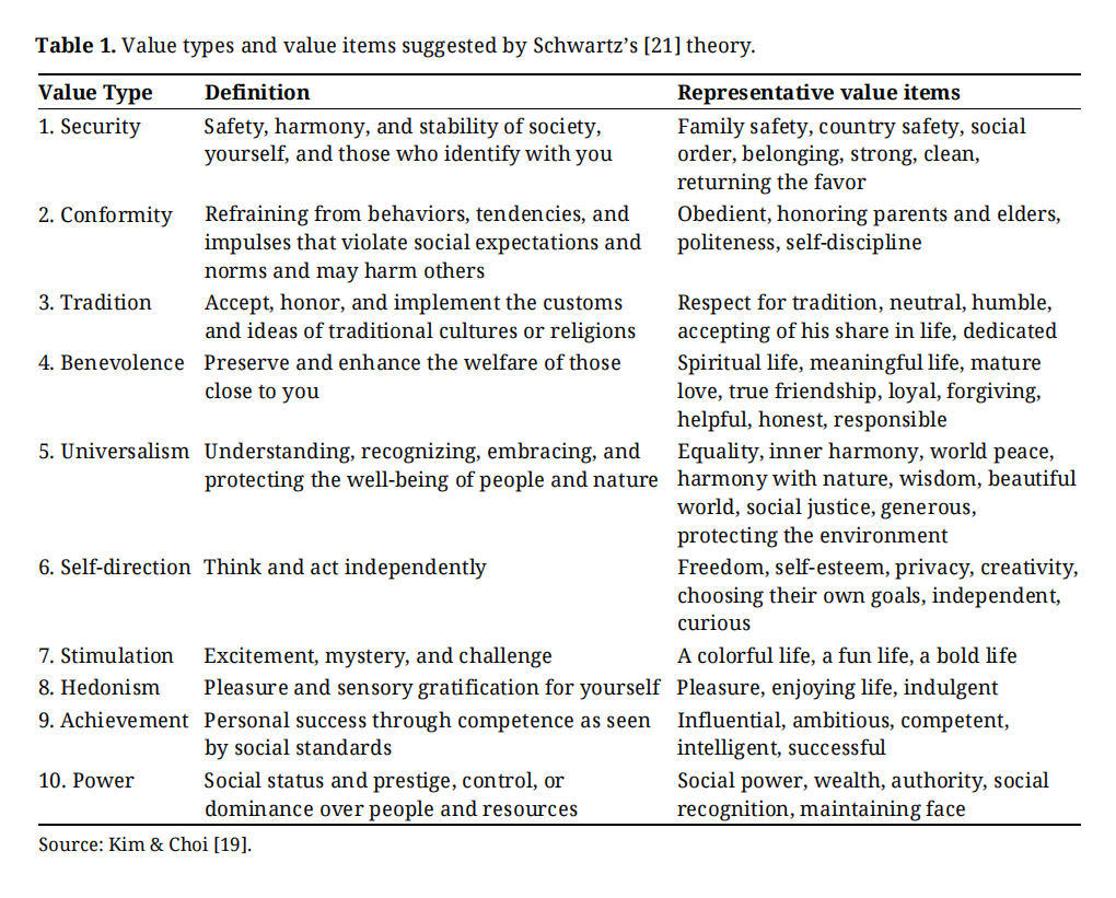Table 1. Value types and value items suggested by Schwartz’s [21] theory.